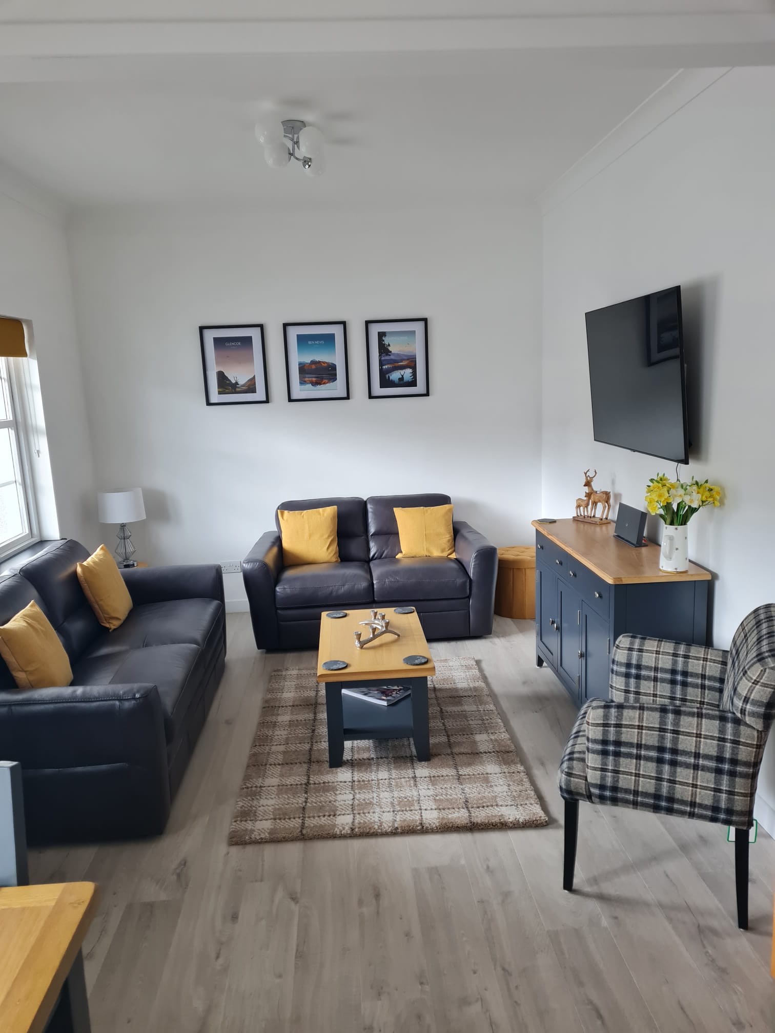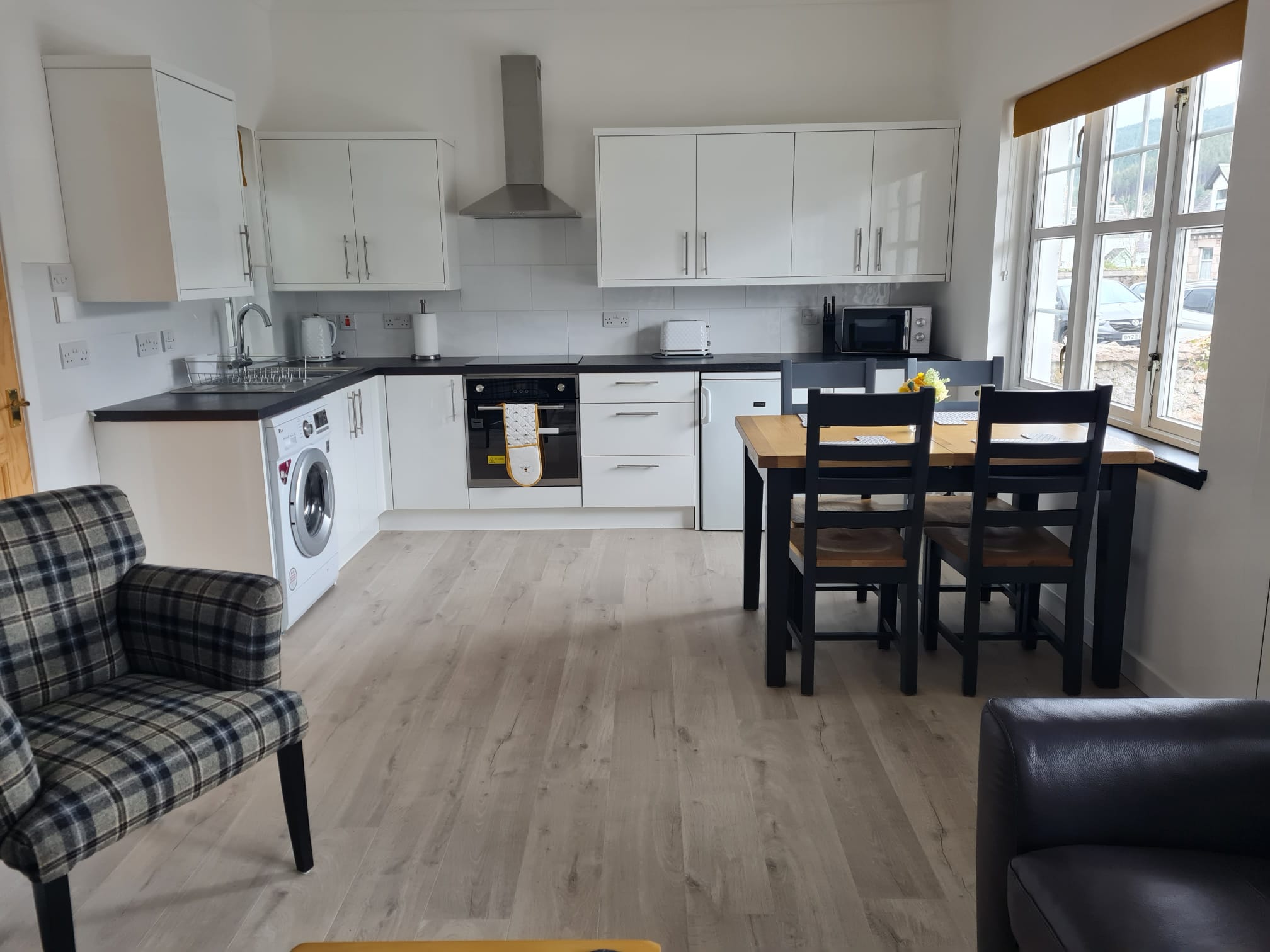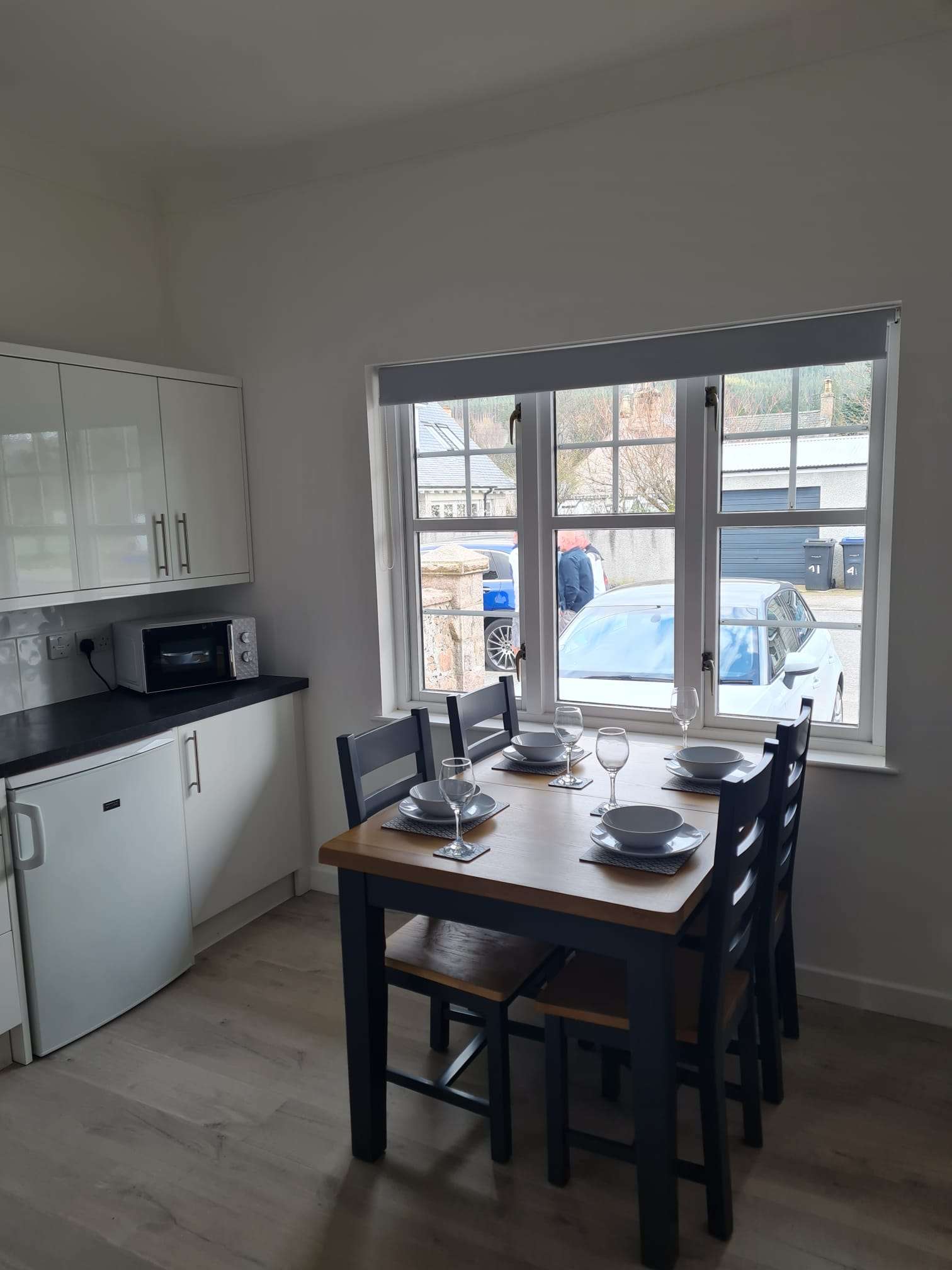 This charming 1 bedroom flat is located in the heart of the historic village of Ballater, offering a comfortable and cosy living space. Recently refurbished to a high standard, the flat features a well-appointed bedroom with a double bed and ample storage space. The open-plan living area includes a fully equipped kitchen, a dining area with seating for four, and a lounge area with a comfortable sofa and a large flat-screen TV. The sofa can also be converted into an exceptional sofa bed, providing additional sleeping space for up to two more adults or a family. Sofa bed use must be notified at the time of booking.
